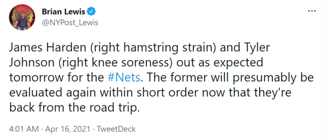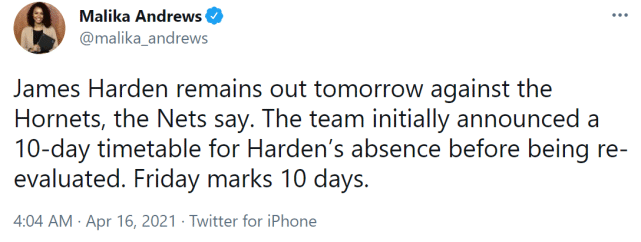 24直播网讯北京时间4月16日,篮网公布了明日对黄蜂一战的伤病名单。哈登(右腿筋拉伤)和泰勒-约翰逊(右膝酸痛)将缺席比赛,掌骨骨折的齐奥扎和十字韧带部分撕裂的丁威迪也不会出场。哈登受伤时,篮网曾宣布他将在10天后接受复查,对黄蜂一战正好是第10天,他已经确定缺席这场比赛,具体回归时间有待新的评估。