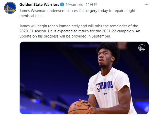 24直播网讯勇士正式官宣20岁榜眼赛季报销,勇士官方发推写道:詹姆斯-怀斯曼成功接受半月板修复手术,赛季报销;怀斯曼立即进行康复,预计将在2021-22赛季季前训练营回归,勇士将在9月份更新他的伤情;怀斯曼在洛杉矶做手术,因半月板撕裂而赛季报销。