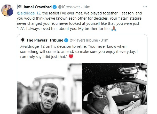 曾经在开拓者做过队友的克劳福德,他在社交媒体上致敬:“阿尔德里奇,我见过最真实的人。我们曾共事过一个赛季,但人们会觉得我俩像熟知彼此几十年。‘明星’身份从未改变过你。你从不会那样看待自己,你就是阿德而已。永远爱你。一辈子的兄弟。”