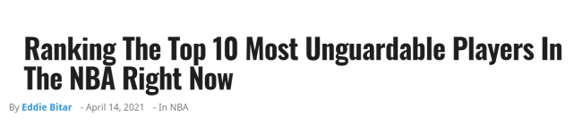 杜兰特仍是最难以阻挡的那个球员。场均28.1分的杜兰特,已经从伤病中彻底康复,并回到了自己的最佳状态。杜兰特最棒的一点就是他的效率,他的三分命中率超过43%,投篮命中率能达到52.8%,而且还拥有接近88%的罚球命中率。美媒认为杜兰特是现役最难防的球员,因为他没有弱点。