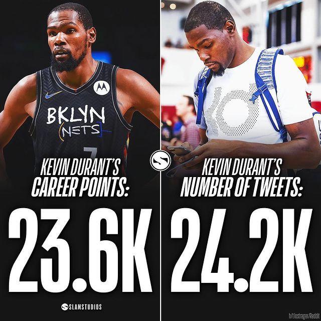 此前有美媒晒出一张趣图,杜兰特生涯总得分是23600分(实际是23561分), 而他累计发推24200条(注:不包括他的小号)。他发推的条数比自己的生涯得分还要多。杜兰特确实需要一些别的事情来打发时光了。