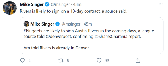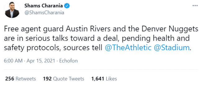 24直播网4月15日讯,据名记查拉尼亚报道,自由球员奥斯丁-里弗斯正在和掘金认真商讨签约。掘金记者跟进报道称,他将签下的是一份10天短合同,目前,里弗斯已经抵达丹佛。掘金后卫穆雷在对勇士比赛中遭遇十字韧带撕裂的重伤,赛季报销。掘金需要填补后场的漏洞,他们计划给小里弗斯一个机会。