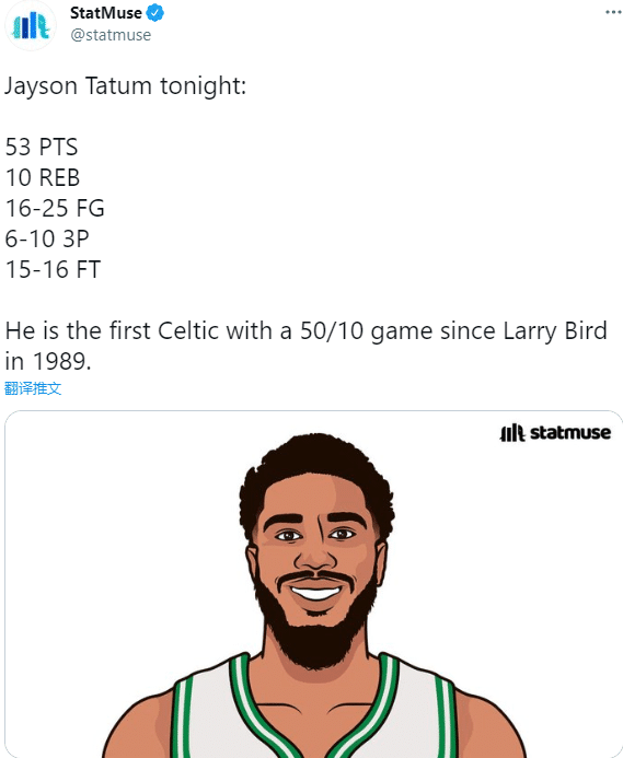 第三、塔图姆单场53分比肩伯德成队史近36年第二高得分,1985年伯德曾狂砍60分。