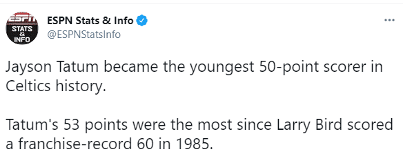 第一、23岁塔图姆成为凯尔特人队史最年轻50分先生。
