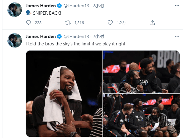 24直播网4月9日讯 篮网巨星詹姆斯-哈登更新动态,晒出三张合影并且发推写道:我告诉兄弟们,如果我们打得好的话,天空才是我们的极限;哈登还专门发推写道:高呼杜兰特回来了!(SNIPER狙击手是杜兰特的绰号);篮网官方转发哈登的动态。