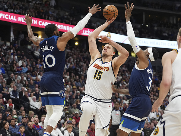 24直播网讯北京时间3月13日,NBA常规赛掘金主场95-115不敌森林狼,本赛季惨遭森林狼三杀;约基奇出战38分钟,23投13中、三分6中2拿到34分8篮板4助攻,提前5分钟认输;爱德华兹22中10拿到29分6助攻4篮板,率队攻陷丹佛并且赛季三杀掘金。
