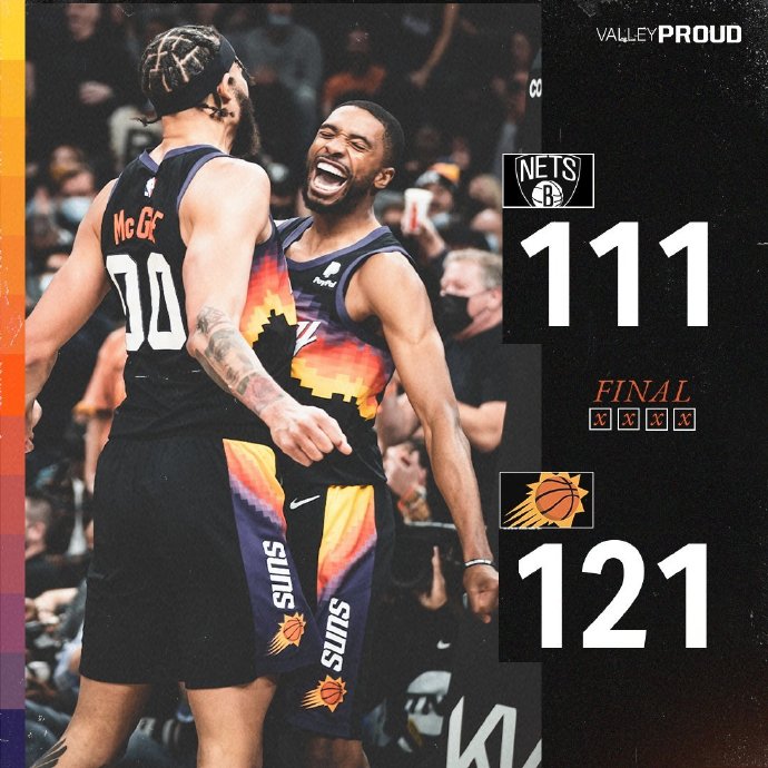 太阳(41-9):布克35分6篮板,保罗20分4篮板14助攻,布里奇斯27分8篮板4助攻,约翰逊16分3篮板,艾顿12分6篮板,麦基5分4篮板。