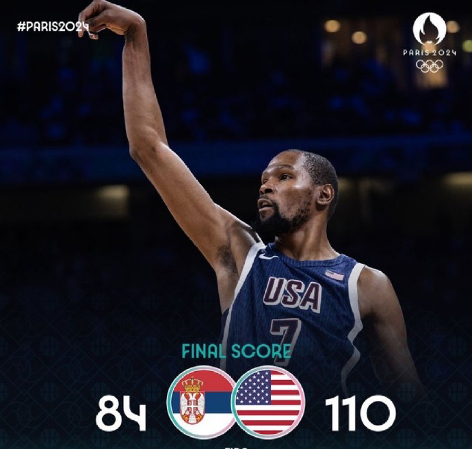 24直播网 7月29日讯 奥运男篮小组赛C组,美国男篮对阵塞尔维亚。比赛开始,塞尔维亚率先发力打出10-2的开局,科尔叫停调整换下恩比德,美国男篮随即轰出12-2强势反超,杜兰特手感火热连续拿分,次节詹姆斯和杜兰特依旧弹无虚发,美国男篮多点开花取得两位数领先,约基奇带队努力追赶,杜兰特压哨帮助美国男篮58-49领先结束上半场。易边再战,塞尔维亚命中率下降,美国男篮攻防两端优势明显不断扩大分差,末节阿德巴约暴扣将分差拉开到20分以上,塞尔维亚苦苦追赶无果。最终,美国男篮110-84击败塞尔维亚。