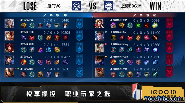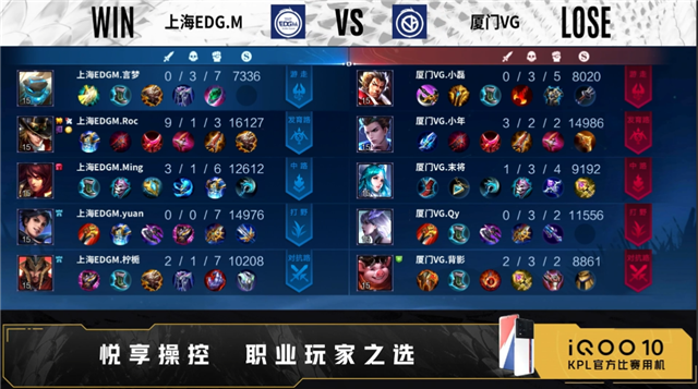 开局双方正常抢线。3分04秒上海EDG.M摧毁敌方对抗路外塔。3分27秒发育路厦门VG击杀盾山,拿下一血。4分06秒野区厦门VG击杀盾山,打出2换1。5分20秒发育路上海EDG.M击杀王昭君,中路击杀狄仁杰,打出0换2,摧毁敌方发育路外塔,厦门VG摧毁敌方对抗路外塔。7分09秒中路厦门VG击杀周瑜,双方打出1换1。8分17秒中路上海EDG.M击杀猪八戒,摧毁敌方中路外塔。9分30秒野区上海EDG.M击杀镜,马可波罗二连击破,打出0换2,摧毁敌方中路二塔。10分13秒野区上海EDG.M击杀张飞,拿下暗影主宰,摧毁敌方对抗路二塔。13分05秒上海EDG.M拿下暗影暴君。14分06秒发育路厦门VG击杀盾山,打出0换1。15分08秒上海EDG.M拿下暗影主宰,摧毁敌方中路高地。16分11秒高地上海EDG.M击杀镜,摧毁敌方发育路高地、对抗路高地,拿下暗影暴君。17分08秒野区厦门VG击杀马可波罗,摧毁敌方发育路外塔。19分01秒对抗路上海EDG.M击杀王昭君,马可波罗二连击破,周瑜二连击破,摧毁水晶拿下比赛。