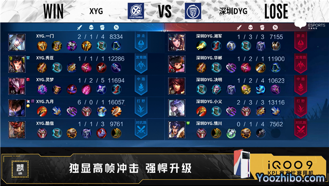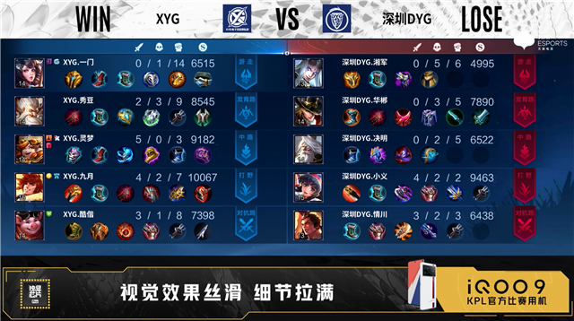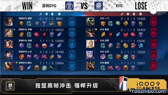 开局双方正常抢线。56秒野区XYG击杀东皇太一拿下一血,深圳DYG击杀两人打出1换2。4分57秒XYG拿下暴君,对抗路XYG击杀吕布,摧毁敌方对抗路外塔,深圳DYG摧毁敌方发育路外塔。6分19秒野区团战XYG打出1换2。7分38秒XYG拿下主宰,发育路深圳DYG击杀大乔。8分52秒野区处深圳DYG娜可露露二连击破,打出2换2。8分35秒深圳DYG拿下暴君。10分25秒深圳DYG拿下暗影主宰,XYG打出0换3,摧毁敌方中路二塔、高地。13分01秒野区XYG 1换5,团灭对手摧毁水晶拿下比赛。