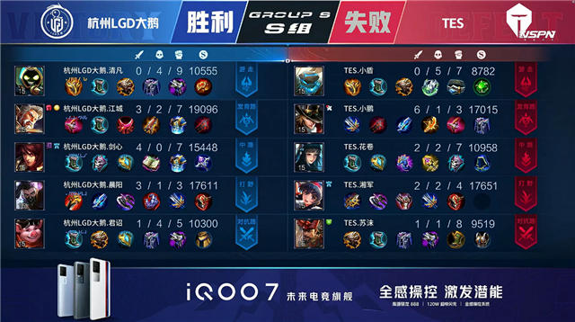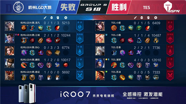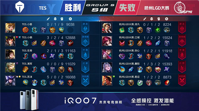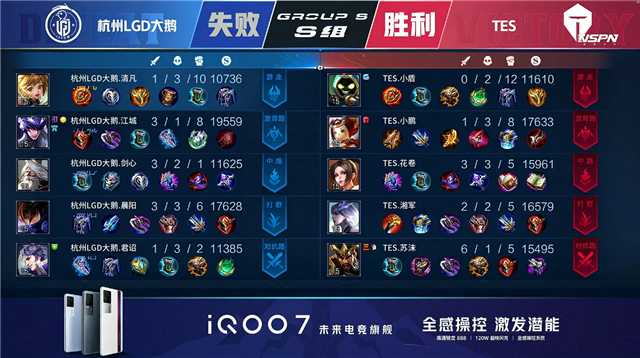 双方平稳开局,1分07秒TES拿下中路河道之灵。1分25秒杭州LGD大鹅野区打出0换2。2分19秒TES拿下暴君。3分05秒杭州LGD大鹅中路击杀不知火舞。4分08秒TES拿下主宰。5分48秒TES摧毁敌方上路外塔。6分39秒中路团战双方2换2。7分15秒TES抢到暴君。8分28秒杭州LGD大鹅上路击杀不知火舞。9分06秒杭州LGD大鹅拿下主宰,TES摧毁敌方下路外塔。10分20秒杭州LGD大鹅下路击杀镜。10分55秒杭州LGD大鹅拿下暗影暴君。11分15秒TES拿下暗影主宰。14分20秒杭州LGD大鹅摧毁敌方中路外塔。15分32秒杭州LGD大鹅拿下暗影暴君。16分14秒杭州LGD大鹅上路击杀不知火舞并摧毁上路二塔。16分58秒TES拿下暗影主宰。18分43秒主宰处团战双方1换1。19分13秒TES摧毁敌方中路外塔。20分28秒野区团战TES打出2换3。23分19秒TES上路击杀澜。23分51秒中路团战TES打出0换3,关羽拿到三连决胜。24分20秒TES摧毁敌方水晶拿下比赛。