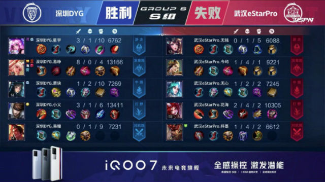 2分钟,小义赵云扎到无心王昭君,萧玦西施接控,王昭君残血交闪撤退,赵云顺势拿下暴君,5分钟,西施拉中今屿虞姬,易峥公孙离点死虞姬拿到一血,6分钟,西施连续给控,星宇瑶一技能探出虞姬位置,公孙离二连击破,少人的eStar野区沦陷,赵云二技能击杀花海百里玄策,7分钟,赵云反红失败被廉颇反控,王昭君大招拍死赵云,8分钟,西施被百里玄策钩中倒地,8分半,公孙离再次击杀虞姬,瑶附体拿到两个人头,9分半,百里玄策钩中赵云无奈无后续伤害被赵云反杀。10分钟,eStar仅剩三路高地,10分半,赵云拿下暗影暴君,11分20秒,无铭大乔开大,eStar五人无兵线推掉DYG下路高地,11分半,易瞳吕布大招逼高地失败,eStar塔下反打二换二,12分半,赵云拿下暗影主宰,13分钟,西施将大乔拉出电梯圈,大乔带线将自己葬送,13分半,eStar中路高地被破,廉颇进场被瞬秒,赵云进场吸引火力换出复活甲,赵云站起扎两人,此时兵线进水晶,公孙离点破,DYG扳回一局。