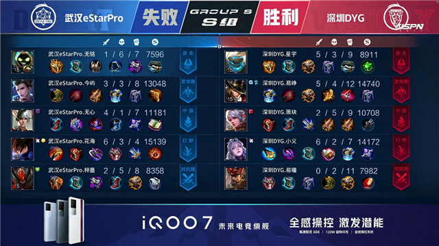 双方平稳开局,1分15秒武汉ES拿下中路河道之灵。1分58秒武汉ES上路击杀露娜拿到一血。2分22秒深圳DYG下路击杀太乙真人。2分59秒下路团战武汉ES打出0换2。3分32秒武汉ES拿下暴君。4分34秒深圳DYG中路击杀白起。4分56秒武汉ES澜主宰处击杀马可波罗。5分56秒深圳DYG中路击杀白起,后续团战深圳DYG再杀太乙真人。7分整武汉ES中路击杀盾山。7分58秒武汉ES拿下暴君,团战深圳DYG打出2换3。9分09秒武汉ES打出0换2。9分30秒武汉ES拿下主宰。10分31秒武汉ES摧毁敌方中路外她,团战武汉ES打出1换2。12分59秒武汉ES野区击杀廉颇。14分45秒武汉ES拿下暗影暴君。14分50秒上路团战双方1换1。15分26秒主宰处团战深圳打出1换3,马可波罗拿到二连击破。16分整深圳DYG拿下暗影主宰并击杀澜、狄仁杰。16分25秒深圳DYG连破中路外、二塔。17分18秒下路团战深圳DYG打出0换3。18分02秒深圳DYG摧毁敌方水晶拿下比赛。
