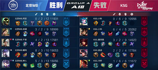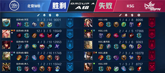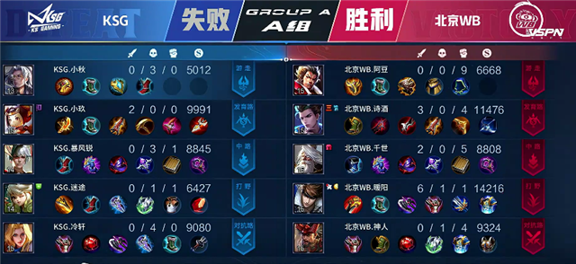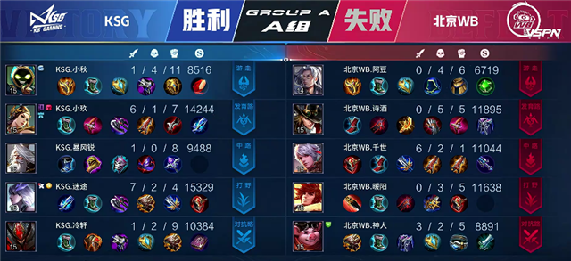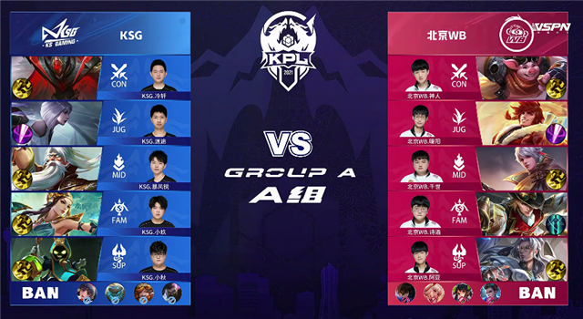 双方平稳开局。1分钟中路河道之灵争夺战,蒙犽拿下一血。1分46秒嬴政被周瑜击杀。2分19秒娜可露露拿下主宰。2分24秒吕布被镜击杀。2分55秒下路团战,蔡文姬被击杀。4分39秒镜在上路单杀吕布。4分46秒娜可露露拿下暴君。6分钟中路团战北京WB打出0换2。6分17秒北京WB下路一塔被破。6分40秒中路再次团战,蔡文姬被击杀。7分50秒蒙犽推掉上路一塔。8分钟镜推掉下路一塔。8分58秒娜可露露拿下暴君。10分钟中路河道团战北京WB打出0换2。10分40秒娜可露露拿下主宰,镜拿下暴君。11分24秒KSG上路一塔被破。11分46秒下河道团战,KSG2换5团灭北京WB,周瑜和娜可露露分别拿下双杀。12分钟KSG推掉中路一塔。13分37秒北京WB上路二塔被破。14分26秒河道团战,北京WB打出0换3,北京WB顺势推掉中路一塔河二塔。16分钟镜拿下主宰。19分钟KSG下路高地塔被破。19分50秒野区团战,蒙犽被击杀,北京WB顺势推掉中路高地塔。20分42秒北京WB拿下风暴龙王。21分30秒北京WB强攻高地,KSG打出1换3。KSG上路高地塔被破。23分钟河道团战,KSG打出0换2,蒙犽拿下双杀。KSG顺势推掉中路一塔和二塔。24分50秒风暴龙王团,北京WB打出0换4。25分22秒北京WB攻破水晶追回一分。