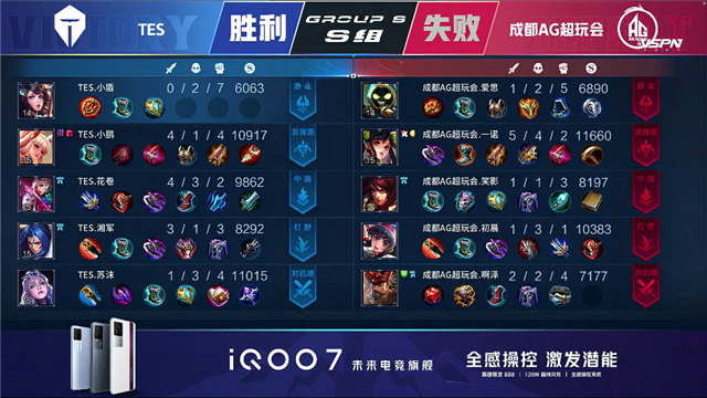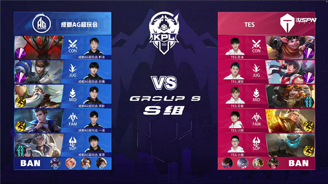 双方和平开局,2分23秒成都AG拿下第一条暴君,4分45秒成都AG拆掉TES下路一塔。5分59秒成都AG上路一塔被破,6分26秒成都AG拿下先知主宰,TES拿下暴君。7分钟中路团战TES打出2换3,拆掉成都AG中路一塔。8分30秒TES击杀成都AG橘右京,10分40秒中路团TES打出0换2,11分05秒TES拿下暗影暴君。12分20秒野区团成都AG击杀太乙真人,12分42秒成都AG拿下暗影主宰。13分16秒成都AG拆掉TES中路一塔,15分10秒野区团TES打出1换3,橘右京天秀击杀姜子牙后被镜击杀。17分钟TES拆掉成都AG上路二塔,17分21秒TES拿下暗影主宰,18分30秒成都AG牛魔被击杀。19分30秒成都AG三路二塔被破,20分34秒团战TES打出0换3,21分04秒TES拆掉成都AG下路高地,成都AG无力防守被一波拆掉水晶。