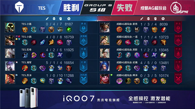 50秒TES虞姬击杀吕布拿下一血,2分11秒成都AG拿下先知主宰,4分钟成都AG拆掉TES下路一塔,4分22秒成都AG拿下暴君。5分钟团战成都AG打出1换2,6分20秒成都AG百里守约被击杀,下路团双方1换1。8分17秒TES拿下暴君,兰陵王被击杀,8分40秒成都AG百里守约击杀不知火舞。9分15秒TES中路一塔被破,10分20秒下路团双方1换1。11分14秒成都AG吕布被击杀,11分30秒TES拿下暗影暴君,成都AG拿下暗影主宰。13分37秒TES上路二塔被破,14分35秒成都AG拆掉TES中路二塔。15分50秒成都AG拿下暗影暴君,17分03秒成都AG打出0换2拆掉TES中下路高地,一波拆掉水晶拿下胜利。