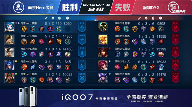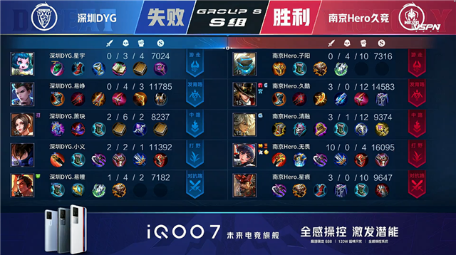 双方平稳开局。1分05秒南京Hero中路击杀盘古拿到一血。2分19秒南京Hero拿下暴君。2分24秒南京Hero下路击杀太乙真人。4分20秒深圳DYG抢到主宰。4分44秒深圳DYG上路击杀橘右京。6分22秒双方互换边路外塔。6分30秒南京Hero拿下暴君。6分47秒南京Hero中路击杀马超。7分35秒上路团战南京Hero打出1换2。7分53秒南京Hero摧毁敌方上路外塔。8分35秒南京Hero拿下主宰。8分54秒南京Hero摧毁敌方中路外塔。10分21秒南京Hero拿下暗影主宰。11分26秒南京Hero橘右京中路以一敌二反杀马超。11分45秒深圳DYG中路击杀蔡文姬,南京Hero摧毁敌方中路二塔。13分21秒南京Hero摧毁敌方下路二塔。14分21秒深圳DYG下路击杀蔡文姬。14分50秒深圳DYG拿下暗影主宰。17分02秒深圳DYG拿下暗影暴君。17分39秒中路团战深圳DYG打出0换3,伽罗拿到二连击破。18分16秒深圳DYG摧毁敌方上路高地塔。19分24秒南京Hero拿下暗影主宰并击杀盘古。19分40秒野区团战南京Hero打出1换4。20分15秒南京Hero摧毁敌方中路高地塔。20分28秒南京Hero摧毁敌方水晶拿下比赛。