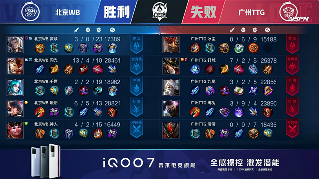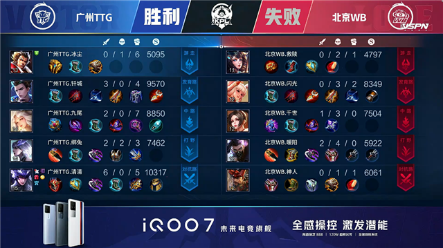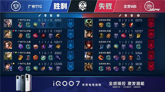 双方平稳开局,1分11秒北京WB拿下中路河道之灵。2分21秒北京WB拿下暴君。6分01秒广州TT摧毁敌方上路外塔,北京WB摧毁敌方下路外塔。6分53秒广州TTG拿下暴君。7分04秒北京WB拿下主宰。7分26秒广州TTG摧毁敌方下路外塔,北京WB摧毁敌方上路外塔。2分43秒中路团战广州TTG打出0换2。8分15秒广州TTG摧毁敌方中路外塔。9分58秒广州TTG野区击杀太乙真人。10分26秒广州TTG拿下暗影暴君。12分14秒广州TTG摧毁敌方中路二塔。12分57秒广州TTG拿下暗影主宰。14分28秒广州TTG中路打出1换3并摧毁敌方中路高地塔。15分02秒广州TTG团灭对手摧毁水晶拿下比赛。