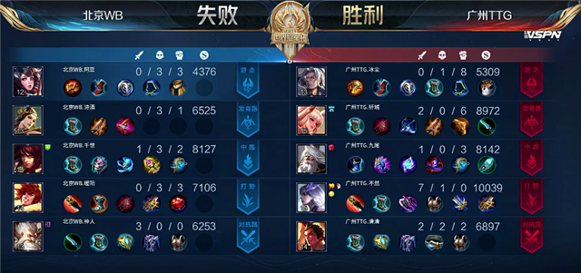 广州TTG开局入侵野区,镜拿下蓝Buff。2分20裴擒虎拿下暴君,吕布击杀裴擒虎拿下一血。3分25秒吕布被击杀。3分30秒虞姬被击杀。4分10秒广州TTG入侵野区,团战广州TTG打出0换3,镜拿下双杀。4分30秒北京WB下路一塔被破。5分30秒广州TTG强推中路一塔,周瑜被击击杀。6分46秒公孙离推掉上路一塔。7分钟镜拿下暴君。7分25秒大乔被击杀。7分55秒北京WB推掉中路二塔。9分18秒虞姬被击杀。9分48秒北京WB中路高地塔被破。10分12秒吕布被击杀。10分23秒镜拿下暴君。11分46秒广州TTG强推水晶拿下本场比赛胜利。
