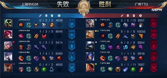 双方和平开局。2分10秒镜拿下暴君。2分30秒广州TTG入侵野区,镜拿下一血,上海RNG.M打出0换2。3分10秒镜入侵野区被吕布击杀。5分25秒镜被击杀。6分50秒下河道团战,广州TTG打出0换2。7分10秒后羿推掉下路一塔。8分50秒下河道团战,广州TTG打出0换3,吕布拿下暴君。10分40秒橘右京拿下主宰。10分05秒后羿推掉中路一塔。11分50秒广州TTG强攻上路高地塔,团战广州TTG打出0换3。12分35秒广州TTG推掉上路高地塔。12分48秒广州TTG推掉水晶拿下本场比赛胜利。