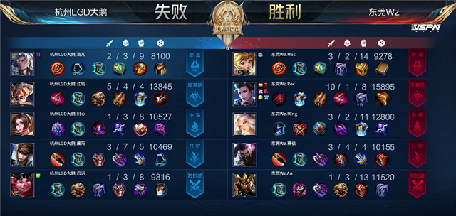 开局东莞Wz入侵野区拿下红Buff。2分14秒兰陵王拿下暴君。2分30秒东莞Wz入侵野区,兰陵王拿下一血。3分钟狄仁杰下路越塔1换1。4分钟兰陵王拿下主宰。5分30秒下路团战,东莞Wz打出0换3,狄仁杰拿下双杀,东莞Wz推掉下路一塔。8分30秒赵云被击杀。8分50秒狄仁杰推掉中路一塔。10分15秒兰陵王拿下主宰。10分35秒野区团战,东莞Wz打出2换3。11分钟东莞Wz强推中路高地塔,嫦娥拿下双杀。12分25秒兰陵王拿下暴君。12分40秒关羽被击杀。13分37秒赵云被击杀。14分钟东莞Wz强推上路高地塔,团战杭州LGD大鹅打出1换2。14分50秒黄忠拿下主宰。14分50秒北杭州LGD大鹅强推中路一塔,团战打出1换2。16分25秒野区团战,双方3换3,狄仁杰拿下三杀。17分51秒赵云拿下暴君。18分30秒东莞Wz强攻高地推掉水晶拿下本场比赛胜利。