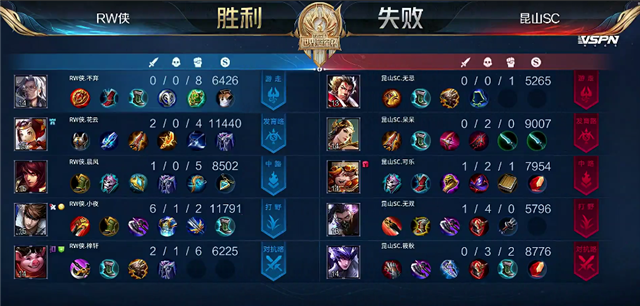 开局RW侠入侵野区拿下蓝Buff。2分18秒赵云拿下暴君。3分50秒上路团战,兰陵王拿下一血,团战RW侠打出1换2。5分30秒赵云拿下主宰。5分40秒鲁班七号推掉下路一塔。5分50秒昆山SC推掉上路一塔。6分钟鲁班七号推掉中路一塔。6分30秒野区团战,RW侠打出1换2。9分22秒鲁班七号推掉中路二塔。10分39秒赵云拿下暴君。10分40秒野区团战,RW侠打出0换3。11分钟 RW侠推掉中路高地塔。12分10秒赵云拿下主宰。13分45秒野区团战,RW侠打出0换3。RW侠顺势下路一波直上高地,14分25秒RW侠推掉水晶拿下本场比赛胜利。
