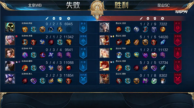 开局北京WB百里守约抢中线。1分05秒北京WB拿下中路河道之灵。1分56秒昆山SC上路击杀马超拿到一血。2分18秒昆山SC拿下主宰。4分17秒主宰处团战北京WB打出1换2。4分40秒昆山SC摧毁敌方下路外塔。5分40秒北京WB下路击杀嫦娥。6分06秒北京WB拿下暴君。6分52秒昆山SC中路击杀不知火舞。7分15秒北京WB中路击杀鲁班大师。7分54秒北京WB上路击杀裴擒虎并摧毁敌方上路外塔。9分09北京WB拿下主宰。10分27秒昆山SC摧毁敌方中路外塔。10分44秒北京WB拿下暗影暴君。13分01秒昆山SC野区击杀兰陵王。13分37秒拿下暗影主宰。14分27秒昆山SC野区击杀不知火舞。14分47秒中路团战昆山SC打出2换4。15分14秒昆山SC摧毁敌方中路高地塔。16分07秒昆山SC中路击杀太乙真人。16分48秒中路团战昆山SC打出2换3。17分14秒昆山SC摧毁敌方水晶拿下比赛。