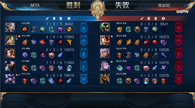 双方平稳开局,1分06秒MTG拿下中路河道之灵。3分21秒双方下路1换1,MTG拿到一血。3分58秒MTG拿下暴君。5分39秒昆山SC中路打出0换2。8分09秒MTG拿下暴君。10分08秒MTG野区击杀太乙真人。10分41秒昆山SC野区击杀不知火舞。10分48秒昆山SC拿下暗影主宰。11分04秒昆山SC摧毁敌方中路外塔。14分36秒MTG摧毁敌方上路二塔。15分35秒昆山SC野区击杀鲁班大师。15分46秒双方在争夺暴君过程中MTG打出1换2。16分30秒MTG暴君处打出1换3,马超拿到二连击破。16分50秒MTG下路击杀露娜。17分16秒MTG摧毁敌方中路二塔。18分02秒MTG拿下暗影主宰。21分58秒中路团战MTG打出2换3。22分18秒MTG摧毁敌方中路外塔。22分42秒MTG团灭对手摧毁水晶拿下比赛。