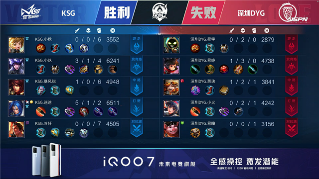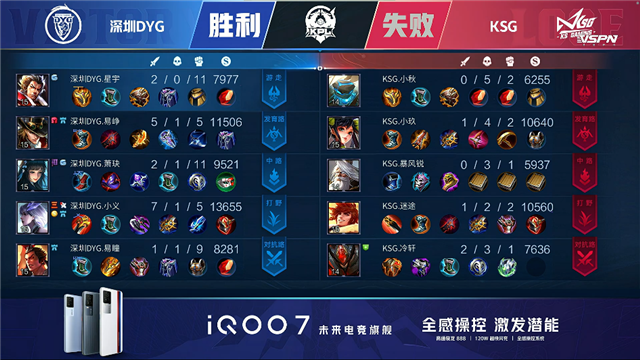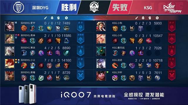 双方和平开局,2分12秒下路KSG马超击杀李元芳拿下一血,2分20秒深圳DYG沈梦溪被击杀。2分53秒KSG拿下暴君,4分34秒中路团KSG打出0换2,5分钟KSG拆掉深圳DYG中路一塔。5分16秒深圳DYG李元芳被击杀,6分25秒深圳DYG中下路二塔被破。6分50秒KSG拆掉深圳DYG中路高地,7分07秒团战KSG打出1换3,深圳DYG无力防守,7分39秒KSG一波拆掉其水晶拿下本局胜利。