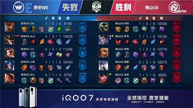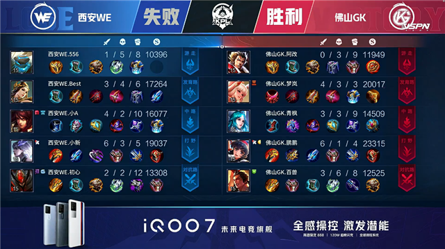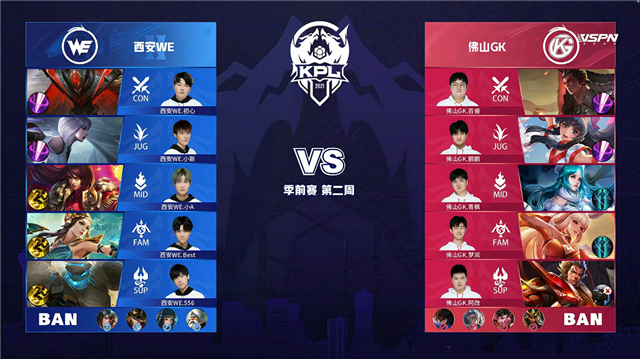 开局佛山GK入侵敌方野区完成四BUFF开。2分12秒佛山GK拿到主宰。3分30秒西安WE下路击杀沈梦溪。3分44秒西安WE拿下暴君。4分47秒西安WE摧毁敌方下路外塔。6分26秒西安WE拿下主宰。8分06秒西安WE中路击杀镜。8分19秒西安WE拿下暴君。10分22秒西安WE拿下暴君。10分52秒西安WE摧毁敌方下路二塔,佛山GK击杀马可波罗。11分17秒佛山GK拿下暗影主宰。12分20秒佛山GK摧毁敌方下路二塔并击杀马可波罗。12分41秒佛山GK高地团战击杀廉颇。12分59秒佛山GK摧毁敌方中路二塔。13分20秒佛山GK摧毁敌方中路高地塔,团战西安WE打出2换3,马可波罗拿到二连击破。16分08秒佛山GK拿下暗影主宰。18分08秒佛山GK野区击杀廉颇。18分21秒佛山GK拿下暗影暴君。20分01秒野区团战佛山GK击杀廉颇。20分40秒中路上河道佛山GK击杀不知火舞。21分整佛山GK中路击杀吕布。21分40秒佛山GK摧毁水晶拿下比赛。
