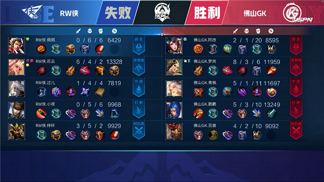 开局佛山GK入侵RW侠红区三Buff开局,2分15秒团战佛山GK周瑜击杀镜拿下一血,打出0换2,3分钟佛山GK拿下第一条暴君。3分45秒佛山GK击杀吕布,4分09秒RW侠中路一塔被破。5分钟下路团双方1换1,6分钟团战粉丝GK打出0换2,6分30秒佛山GK拆掉RW侠上路二塔。7分40秒中路团佛山GK打出0换2,拆掉RW侠中路二塔,8分28秒佛山GK下路二塔被拆。10分07秒中路团佛山GK击杀吕布,10分28秒RW侠上路高地被拆。10分50秒佛山GK拿下暗影暴君,11分39秒中路团佛山GK打出1换2,12分12秒佛山GK击杀镜。13分44秒中路团RW侠打出2换4,14分12秒RW侠拿下暗影主宰。16分06秒中路团佛山GK打出1换2,17分03秒团战佛山GK打出0换2。17分36秒中路团战爆发,佛山GK周瑜带领上路兵线独自一人拆掉RW侠水晶,拿下本局胜利。