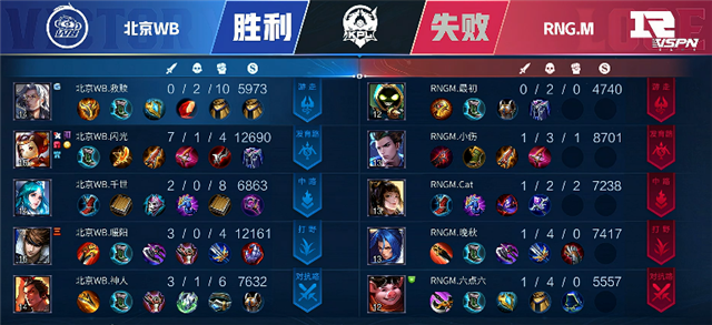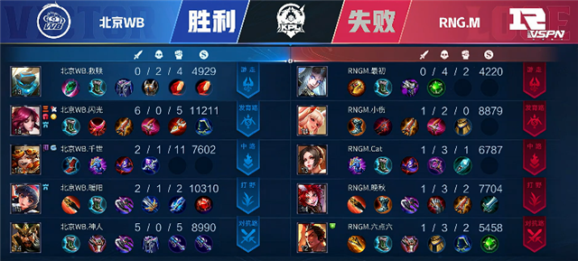 开局RNG.M中路和上路换线。1分36秒王昭君抢下蓝buff。2分15秒RNG.M拿下暴君,北京WB拿下主宰。4分15秒下路一塔团战,RNG.M打出2换2,鲁班七号拿下一血。6分24秒橘右京推掉下路一塔。6分58秒橘右京拿下暴君,同时自己也被吕布击杀。7分40秒中路上野区团战,北京WB打出1换3。8分40秒北京WB推掉中路一塔。9分07秒上野区团战,太乙真人被击杀。9分39秒RNG.M上路二塔被推。10分24秒,吕布抢下主宰并拿下双杀。11分20秒,鲁班七号击杀猪八戒,同时推掉下路二塔和高地塔。12分30秒中路河道团战,北京WB打出0换5。12分50秒北京WB攻破水晶拿下本局比赛。