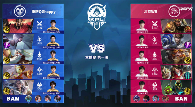 开局重庆QGhappy猪八戒换线到中路。1分51秒下路一塔团战,不知火舞拿下一血,2分钟重庆QGhappy拿下暴君。2分47秒廉颇入侵蓝区被王昭君击杀。4分30秒下路爆发团战,北京WB打出0换3并顺势推掉下路一塔。6分24秒北京WB主宰逼团,蔡文姬被击杀。6分40秒上路一塔北京WB越塔爆发团战打出1换1,重庆QGhappy顺势推下北京WB中一塔和上一塔。7分40秒重庆QGhappy拿下主宰。10分钟重庆QGhappy拿下暴君。11分20秒大乔老夫子带线偷掉下路二塔。11分55秒北京WB下路二塔爆发团战,重庆QGhappy打出1换2。13分钟娜可露露拿下主宰。16分10秒重庆QG上路逼团击杀王昭君并推掉二塔。17分40秒北京WB推掉中一塔。18分27秒在上路野区小胖被暖阳击杀。20分钟28秒大乔老夫子偷掉上路一塔。21分39秒北京WB风暴龙王逼团,重庆QGhappy打出0换3,22分23秒重庆QGhappy强推高地公孙离被击杀。23分17秒北京WB拿下风暴龙王。23分48秒北京WB推掉下路高地塔。24分40秒北京WB上路逼团老夫子被击杀,25分钟重庆QGhappy中路高地塔被破。27分40秒中路下河道草爆发团战重庆QGhappy打出1换2。29分8秒中路下河道草再次团战,北京WB打出1换5。29分30秒北京WB推掉水晶拿下本局比赛。