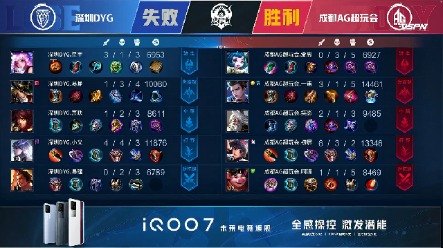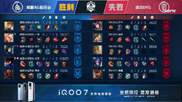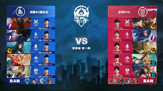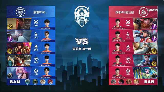 双方平稳开局,2分52秒深圳DYG中路越塔击杀娜可露露拿到一血。3分38秒深圳DYG野区击杀蔡文姬。3分49秒深圳DYG拿下暴君。5分13秒成都AG摧毁敌方下路外塔。5分34秒成都AG下路击杀马可波罗。6分03秒成都AG野区击杀周瑜。6分18秒成都AG摧毁敌方下路二塔。6分44秒成都AG中路击杀镜。9分06秒双方下路1换1。9分20秒成都AG摧毁敌方中路外塔。9分35秒成都AG下路击杀镜。10分30秒成都AG拿下暗影暴君。11分14秒成都AG摧毁敌方上路二塔。11分39秒成都AG摧毁敌方中路二塔。12分06秒成都AG拿下暗影主宰。13分25秒中路双方1换1,成都AG摧毁敌方中路高地塔。13分44秒成都AG摧毁敌方下路高地塔。13分59秒野区团战深圳DYG打出1换2。15分整暴君处团战成都AG打出2换3。15分34秒成都AG摧毁敌方水晶拿下比赛。