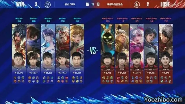 决胜局,佛山DRG蓝色方,拿到了澜+戈娅。成都AG红色方,拿到了曜+后羿。开局佛山DRG击杀后羿,拿下一血。6分钟,佛山DRG击杀小乔,直推中路一塔。16分钟,佛山DRG直推中路高地,成都AG曜一秀三换掉两人。决胜团,佛山DRG连杀四人,一波直推水晶,拿下最终胜利!