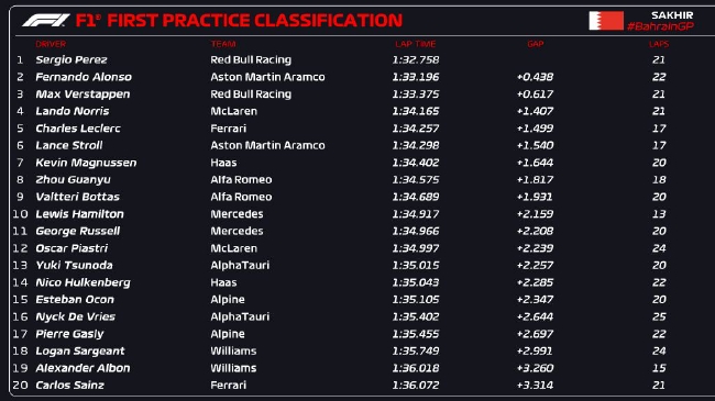 24直播网讯 2023F1巴林大奖赛第1次练习赛结束。红牛车队佩雷兹1:32.758圈速头名,阿斯顿马丁车队阿隆索和另一位红牛车手维斯塔潘二三名。诺里斯、勒克莱尔、斯托尔、马格努森、周冠宇 、博塔斯、汉密尔顿分列四至十位。