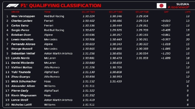24直播网讯 北京时间10月08日,2022年F1日本大奖赛排位赛结束,凭借Q3第一个飞驰圈的出色发挥,红牛车队维斯塔潘顺利拿到日本大奖赛的杆位!法拉利车队勒克莱尔和塞恩斯两位法拉利车手分列第二和第三。