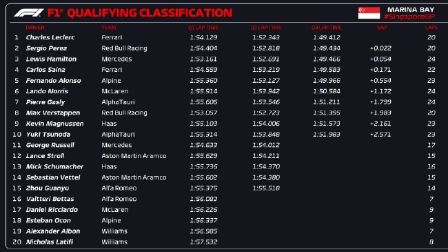 2022年F1新加坡大奖赛排位赛成绩表: