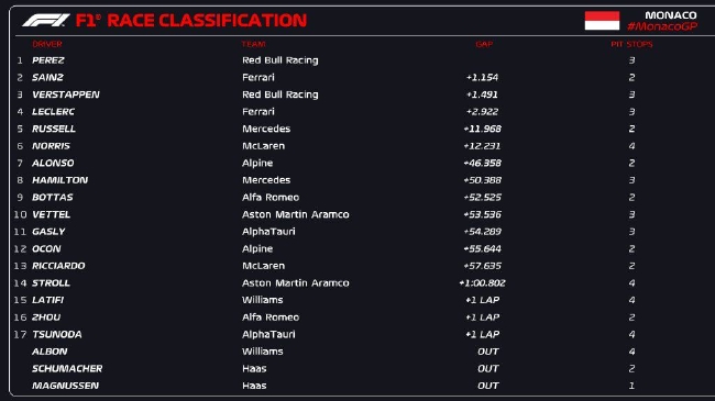 24直播网讯 2022年F1摩纳哥大奖赛正式比赛在蒙特卡洛赛道结束,红牛车队佩雷兹在比赛前半段利用进站策略超越塞恩斯和勒克莱尔取得领跑;比赛尾声阶段,他顶住塞恩斯的进攻,拿到个人赛季第一座分站冠军!也是个人F1生涯第三个冠军!法拉利车队塞恩斯亚军,维斯塔潘季军。
