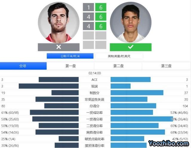 第三盘阿尔卡拉斯第3局完成破发,第6局卡恰诺夫完成了本场比赛的首次破发,将局分追到3-3。第7局阿尔卡拉斯再破卡恰诺夫发球局,第8局他保发取得5-3的优势。第9局卡恰诺夫在自己没有退路的一局顽强挽救5个赛点保发,第10局阿尔卡拉斯顺利保下发球胜赛局,6-4赢下第三盘比赛。
