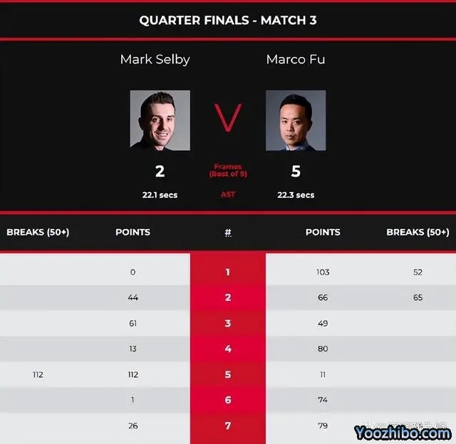 第六局,傅家俊率先上手,单杆25分后断掉。塞尔比上手只打进1颗红球就断掉。傅家俊再次上手,拿下单杆49分,以74-1再胜一局,大比分4-2率先拿到赛点。