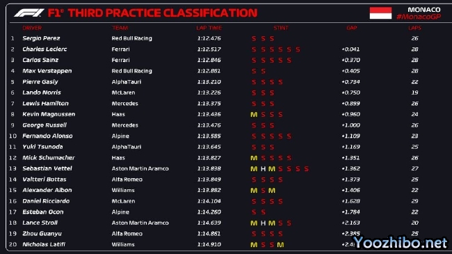 24直播网讯 北京时间5月27日,2022年F1摩纳哥大奖赛第3次练习赛在蒙特卡洛赛道结束,红牛车队佩雷兹最后时刻做出去1:12.476的成绩,取得三练第一,这也是本周末目前为止的最快单圈成绩;法拉利车队勒克莱尔落后0.041秒排名第二,另一位法拉利车手塞恩斯第三,落后0.370秒;维斯塔潘第四。
