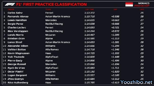 24直播网讯 2023年F1摩纳哥大奖赛第一次练习赛结束,两位西班牙车手占据前二,法拉利车队塞恩斯1:13.372取得一练头名,阿斯顿马丁车队阿隆索落后0.338秒位居第二。汉密尔顿和佩雷兹位列第三和第四,他们与塞恩斯的单圈差距都超过了0.6秒。主场作战的勒克莱尔第五。