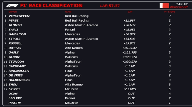最终,维斯塔潘几乎全场领跑,夺得2023赛季第一冠。佩雷兹也表现出色,拿下第二。阿隆索夺得季军,继2021年卡塔尔站之后再次站上领奖台。