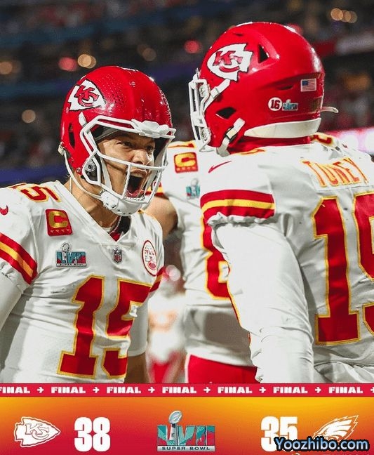 24直播网讯 2月13日讯 北京时间2月13日上午7点半,第57届超级碗在亚利桑那的州立农业体育场举行,堪萨斯酋长对阵费城老鹰。上半场酋长四分卫马霍姆斯传出1个达阵,老鹰四分卫杰伦-赫茨传出1个达阵并自己跑出2个达阵,帮助老鹰24-14领先酋长。下半场马霍姆斯再次传出2个达阵,而赫茨再次完成1次冲球达阵,最终酋长38-35战胜老鹰,马霍姆斯时隔3年再次夺冠!
