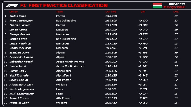 2022年F1匈牙利大奖赛第1次练习赛成绩表: