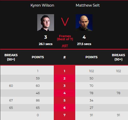 第一局,塞尔特单杆102分顺利破百,局分1-0领先。第二局,威尔逊59-50拿下,比赛过程较为波折,两人得分都没有实现单杆50+。第三局,威尔逊虽然拿到单杆60分,但是进攻出现失误,给了塞尔特上手的机会。对方上手拿到70分,完成逆转和绝杀,局分2-1领先。