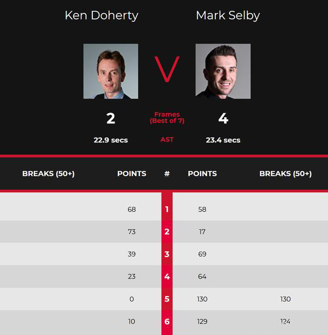 第五局和第六局,塞尔比更是爆发,轰出了单杆130分和单杆124分,130-0+129-10,连赢两局,塞尔比4-2晋级。
