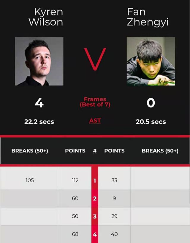 第四局,凯伦-威尔逊单杆14分失误;范争一单杆16分失误;凯伦-威尔逊打进一颗红球;凯伦-威尔逊单杆13分失误;范争一单杆6分摔袋;凯伦-威尔逊机会球不进,范争一单杆18分失误;凯伦-威尔逊单杆16分防守;范争一再次送上机会,凯伦-威尔逊单杆20分拿下比赛!