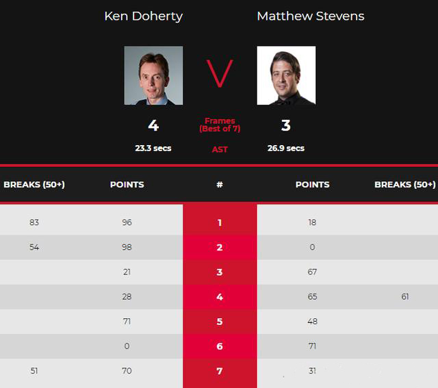 24直播网讯 北京时间3月2日晚,2021斯诺克直布罗陀公开赛首轮比赛继续进行。51岁的前世界冠军达赫迪迎战马修·史蒂文斯,两人大战7局,达赫迪打出单杆83分、54分、51分,尤其决胜局那杆51分相当精彩,最终以4比3惊险晋级。